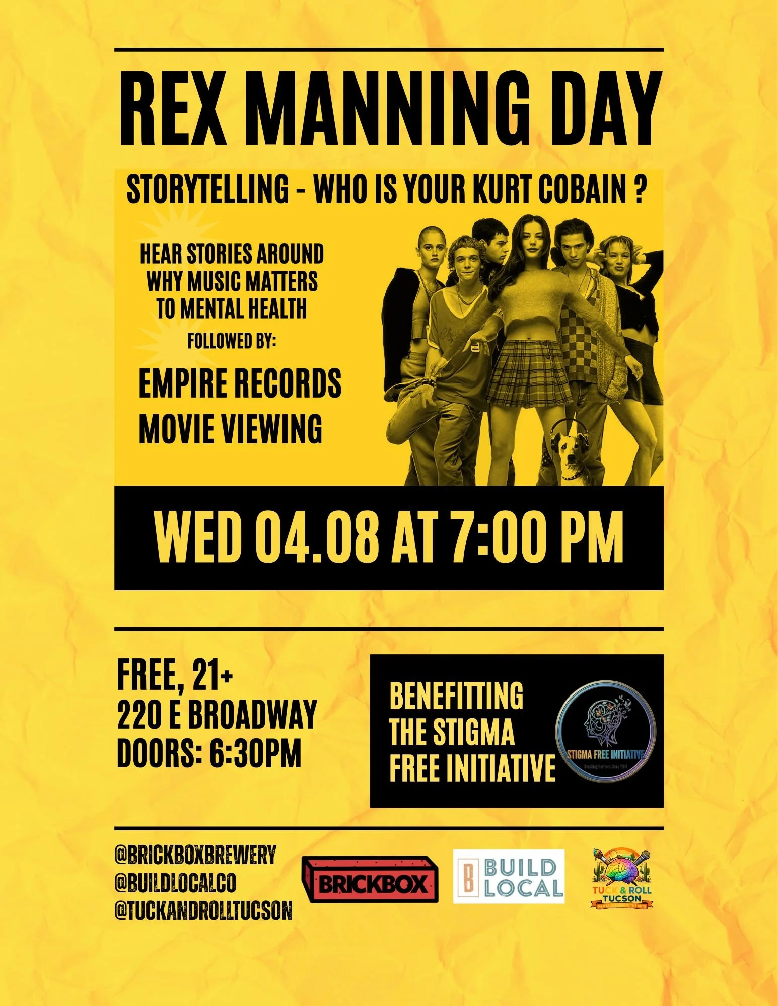 SFI is honored to be the beneficiary of this showcase of storytellers sharing how music and art helped mental health struggles. Immediately following, catch the movie viewing of Empire Records.